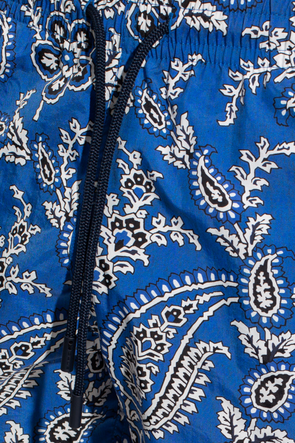 Blue swim shorts from Etro. Embellished with the brand's signature paisley pattern in navy blue and white and a ‘Pegaso’ logo patch, this pair comes with a patterned drawstring pouch and features two side seam pockets, one back velcro-fastened flapped pocket and a relaxed silhouette.
