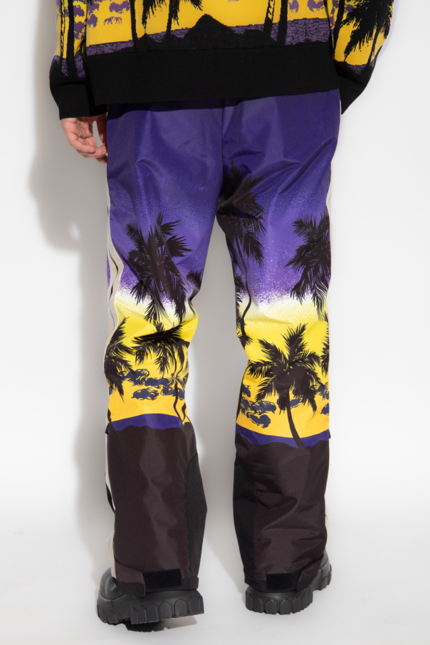 Purple and black ski trousers from Palm Angels. Embellished with a palm tree & logo pattern, this pair features an elasticated waistband, a snap fastening, three zip pockets, elasticated cuffs and beige and black panels down the sides.