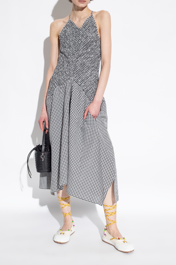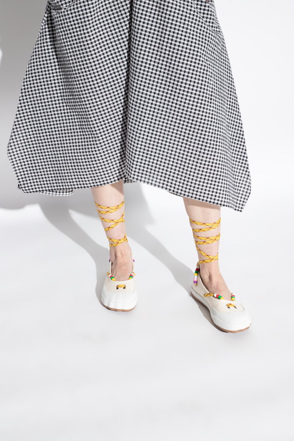 Cream ‘Animal’ ballet flats from Vivienne Westwood. Made of rubber-trimmed canvas, this pair features yellow and maroon ankle ties with multicolored beads and rubber sole in white and brown.