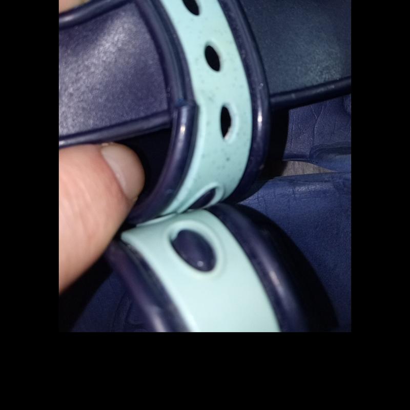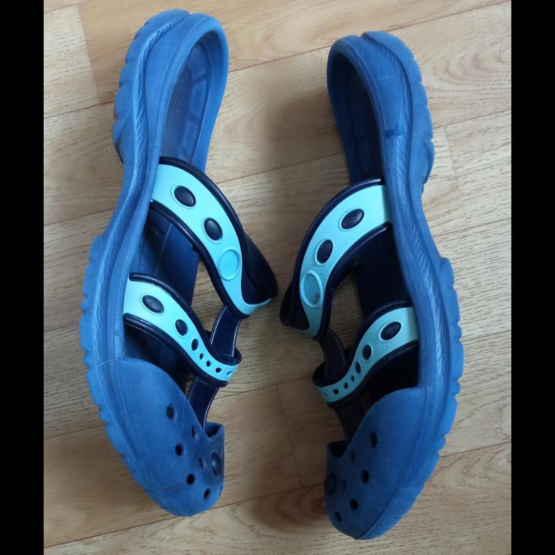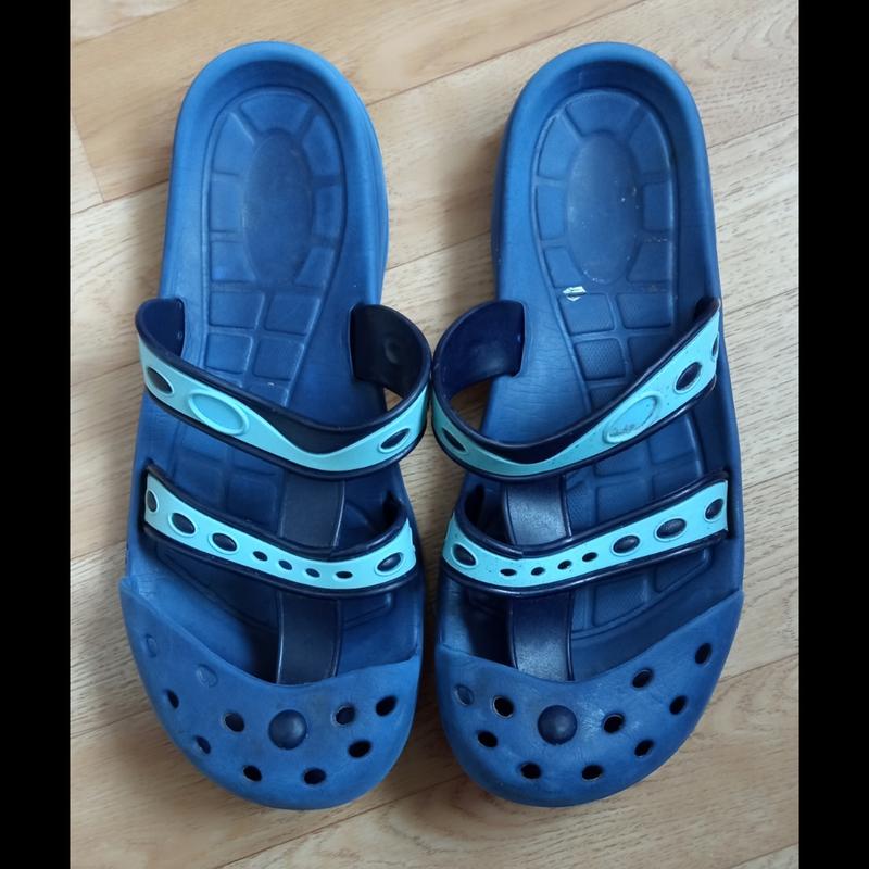 шлепанци всем известные .лёгкие прочные мягкие с трёх цветов.состояние очень хорошее но есть на двух вверху фото по трещенке округлой окантовки..она дальше не пойдет.там литая голубая деталь... и подошва испачкана при домашнем ремонте пеной монтажной.нет раствор.чтобы вытереть.да его и не видно всеравно.сотрется на улице.размер-44. стелька -28.5 см фото.так по пятку а не на бортики становится чтобы...