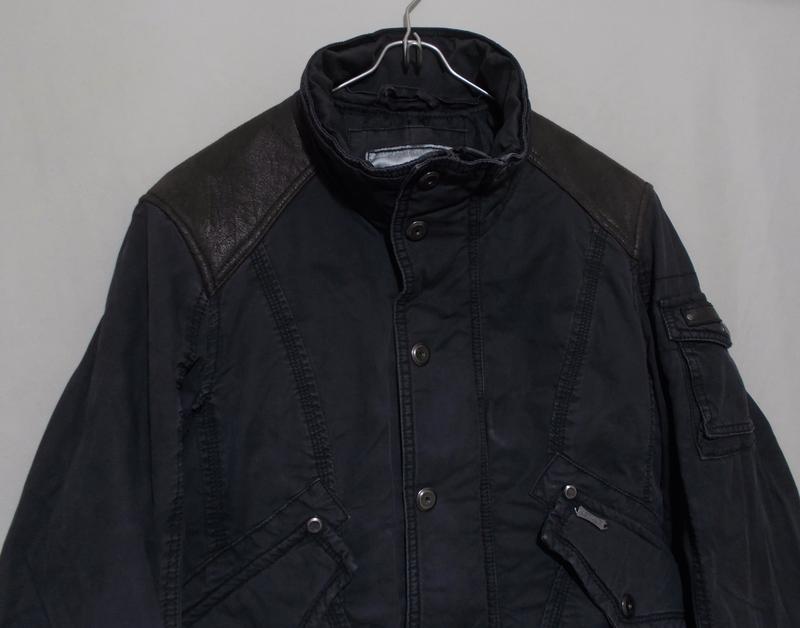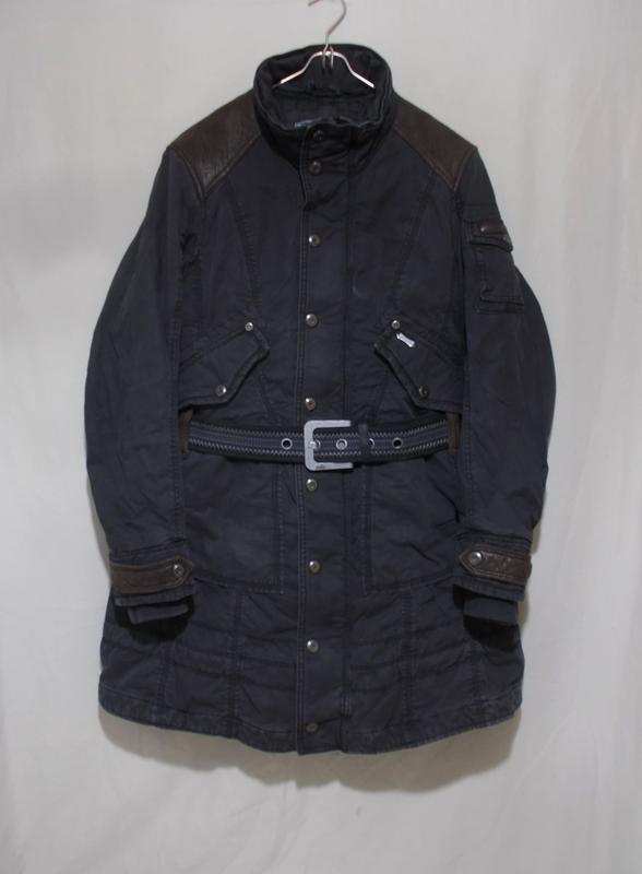 Куртка в отличном, близком к идеальному состоянии - нет капюшона и заменен пояс. Джинс красиво помытого серого цвета средний, плотного плетения нитей, тяжелый (1700 грамм). Застежка на мощную тракторную молнию с фирменным бегунком и планку с металлическими кнопками с гравировкой бренда, на рукавах выступающие плотные манжеты. Ворот-стойка, внутри осталась половинка молнии для капюшона, приталенный фасон, внутри над низом заправлена регулировочная тесьма, пояс в шлевках, по бокам карманы, вход сбоку, над ними клапаны-обманки. Стеганая подкладка из плотного нейлона на синтепоне, плечи, хлястики рукавов и шлевки из мягкого коричневого материала, напоминающего замшу. Заявлена, как зимняя, но скорее демисезон.