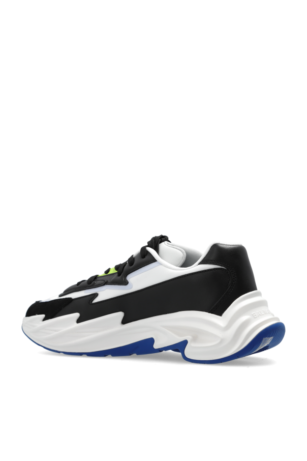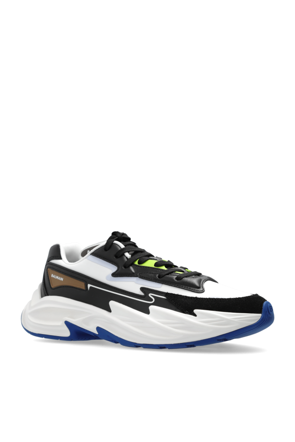 Black and white ‘Run-Row’ sneakers from Balmain. Made of leather and fabric, this lace-up pair features rubber inserts in green, brown and light blue, a logo and a decorative rubber sole in blue and white.