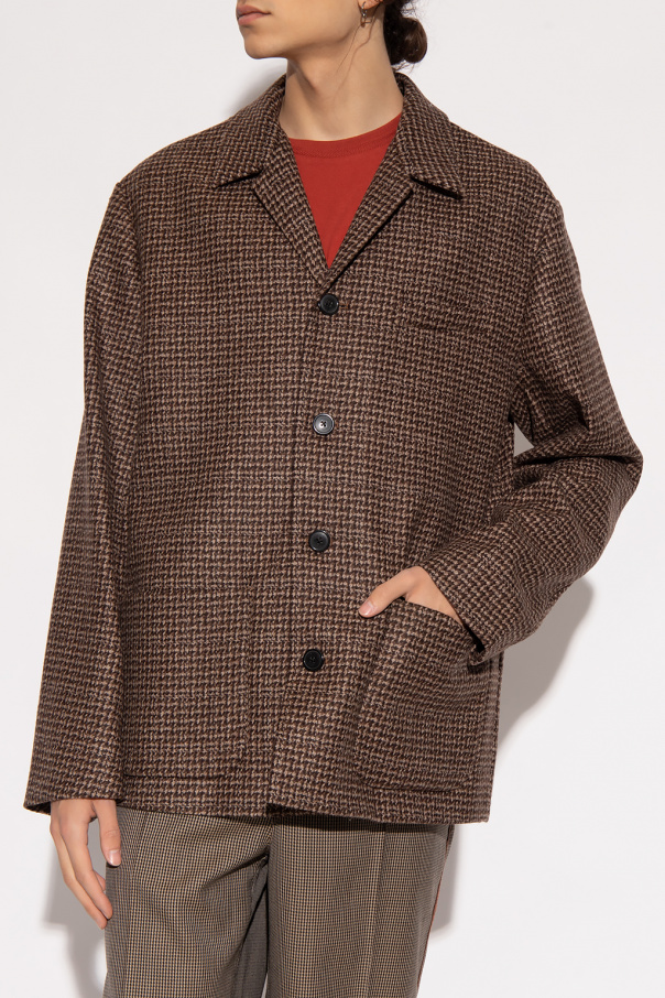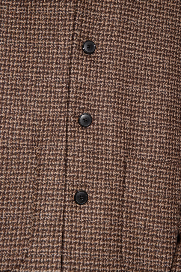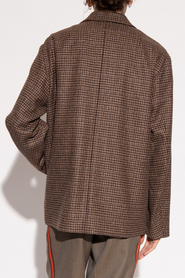 Brown and cream blazer from Dries Van Noten. Crafted from wool, this style features a houndstooth pattern, notch lapels, button fastenings, three slip pockets and long sleeves.