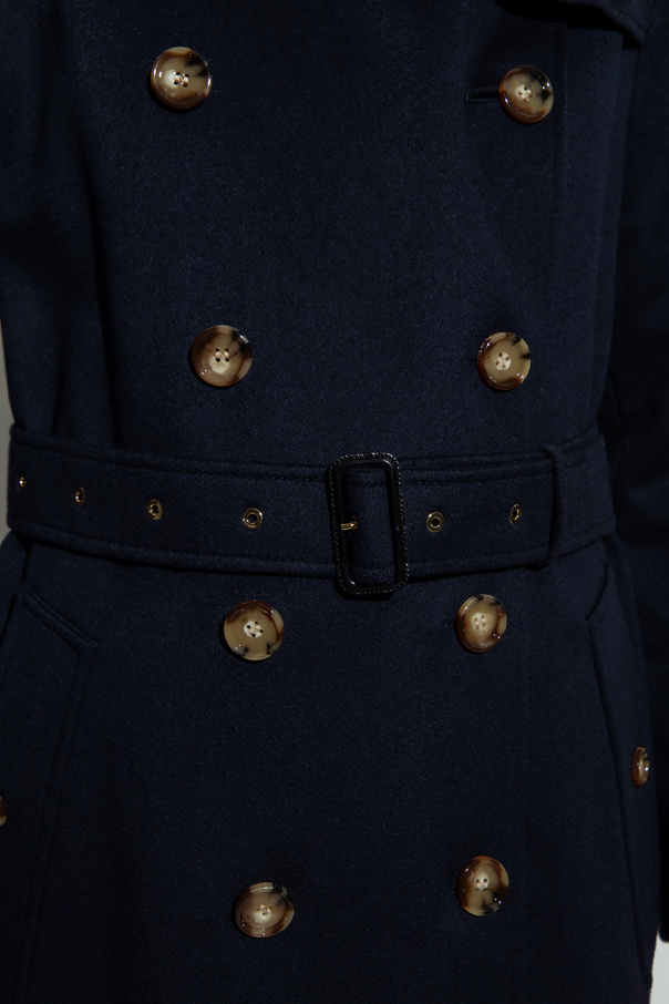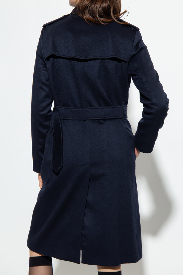 Navy blue trench coat from Burberry. Made of cashmere with a double-breasted silhouette, this style features button fastenings, two button pockets, a waist-cinching belt with a buckle, epaulettes on the shoulders, long sleeves and a single back vent.