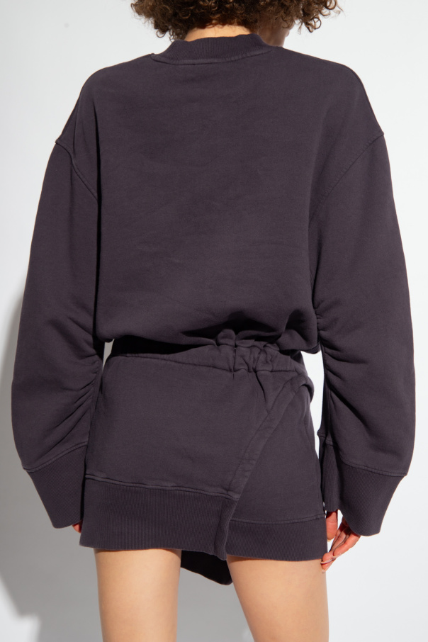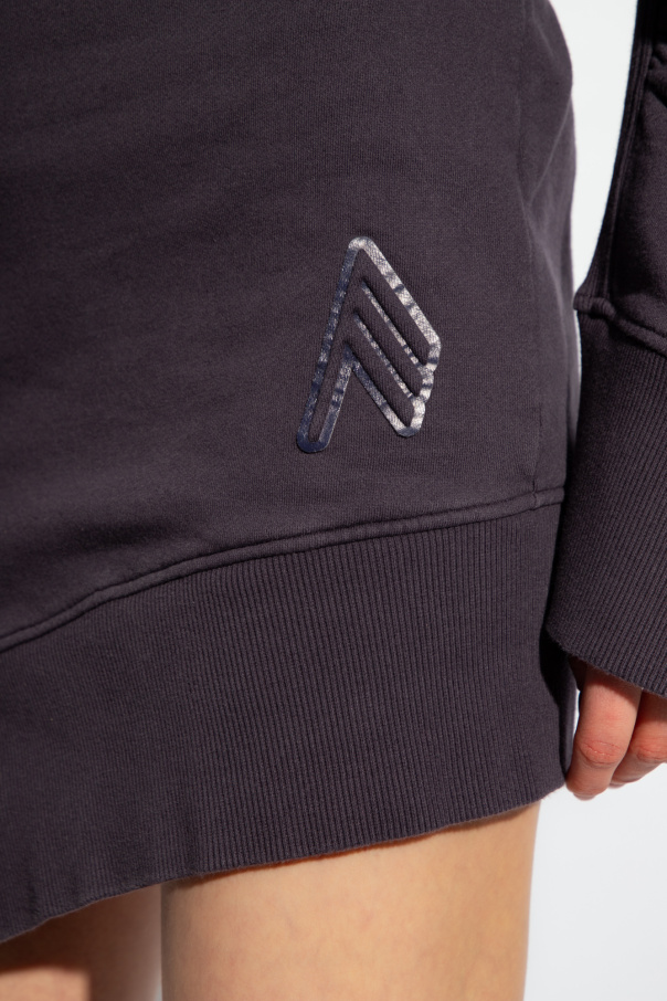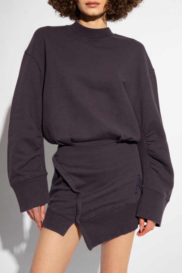 Purple ‘Ivory’ mini dress from The Attico. Made of cotton with a relaxed fit, this style is embellished with a logo patch and features an elasticized insert on the back, an asymmetrical bottom and elasticized trims on the standing collar, long sleeves and hem.