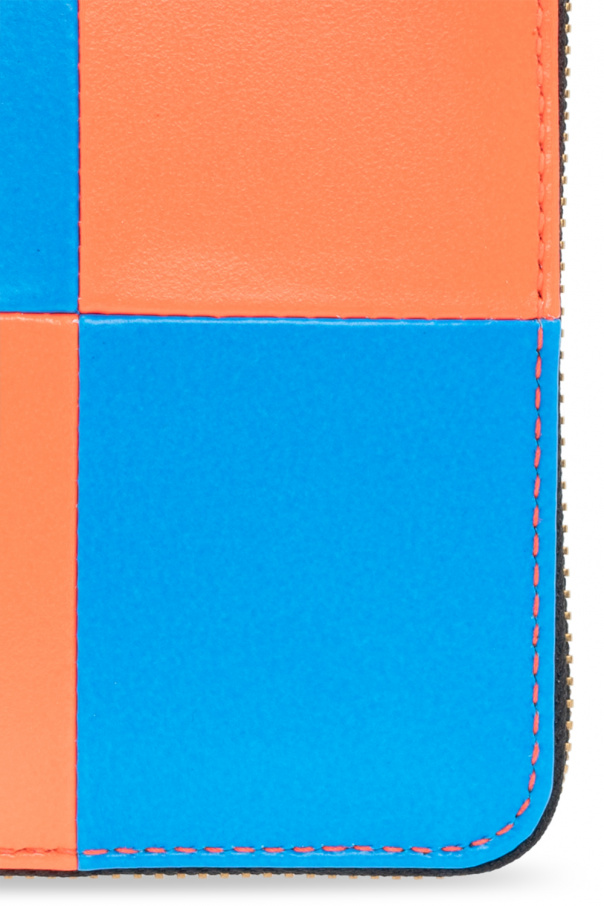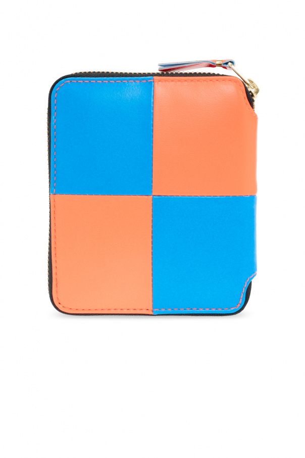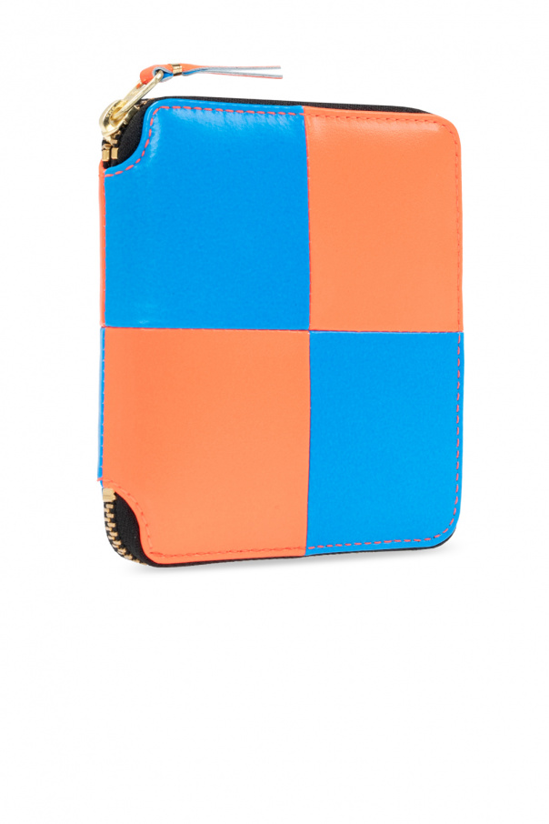 Blue and orange wallet from Comme des Garçons. Crafted from goat leather, this design fastens with a gold-tone zip and showcases an embossed gold-tone logo and an interior with a bill compartment, one slip pocket, four card slots and a snap-fastened coin pocket.