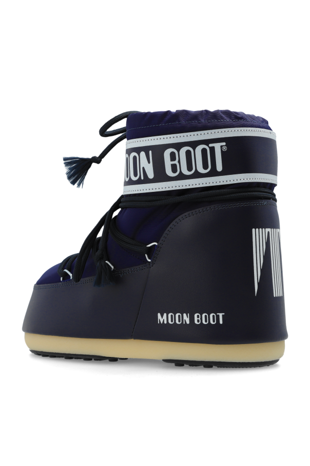 Presenting the Icon Low Nylon Snow Boots by Moon Boot, an exquisite blend of style and functionality. These boots are crafted for those who seek both elegance and resilience in their winter footwear. The Icon Low Nylon snow boots boast a distinctive, substantial shape with rounded tips, setting them apart from their taller counterparts. The low-cut design offers a modern twist while maintaining the brand's iconic aesthetic. Meticulously constructed, the upper part of the boot is fashioned from durable nylon, ensuring resistance to moisture and snow. The lower section is enveloped in either rubber or synthetic material, providing additional protection against cold and water. Inside, the boots are lined with a plush, white, fur-like material, guaranteeing supreme thermal comfort. Adorned with a prominent strap featuring the "MOON BOOT" inscription in white, these boots exude sophistication. Adjustable laces with decorative tassels allow for a customized fit, while the side also proudly displays the "MOON BOOT" logo. The light-colored sole contrasts beautifully with the navy blue hue of the boots, adding a touch of elegance. The Icon Low Nylon snow boots are predominantly navy blue and are equipped with a robust, anti-slip sole, ensuring excellent traction on snow and ice. Why Choose This Product? Distinctive low-cut design for a contemporary look. Water-resistant nylon upper for reliable protection against elements. Plush internal lining for exceptional warmth and comfort. Adjustable laces for a tailored fit. Anti-slip sole for secure footing on icy surfaces.