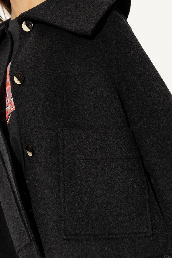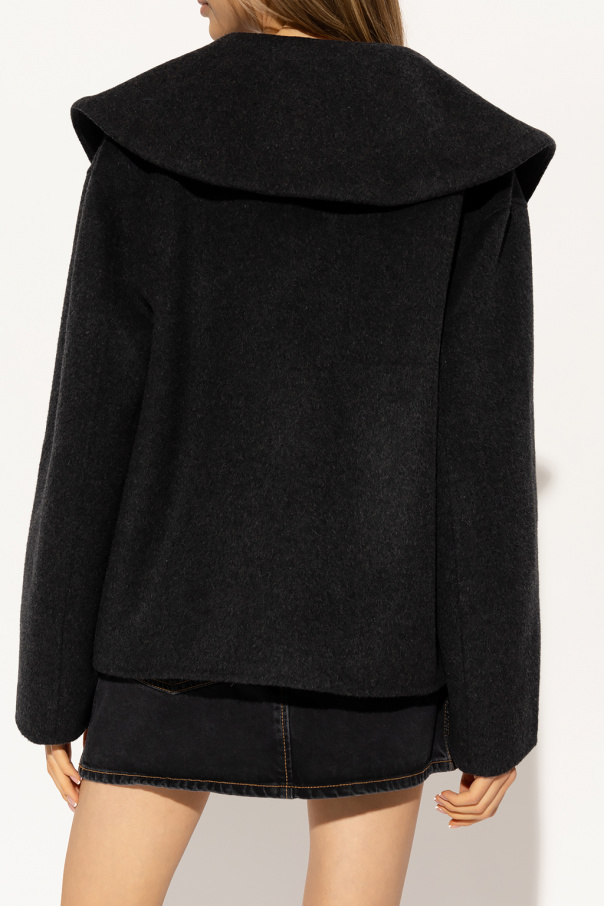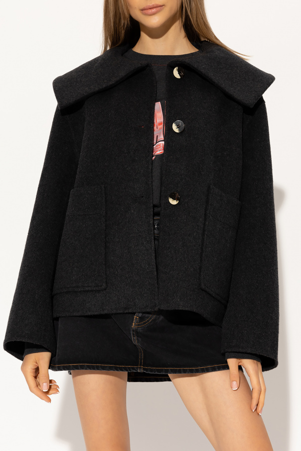 Dark grey jacket from Ganni. Crafted from a fabric blend including recycled wool, this style features an oversized collar, button fastenings, two slip pockets and long sleeves.