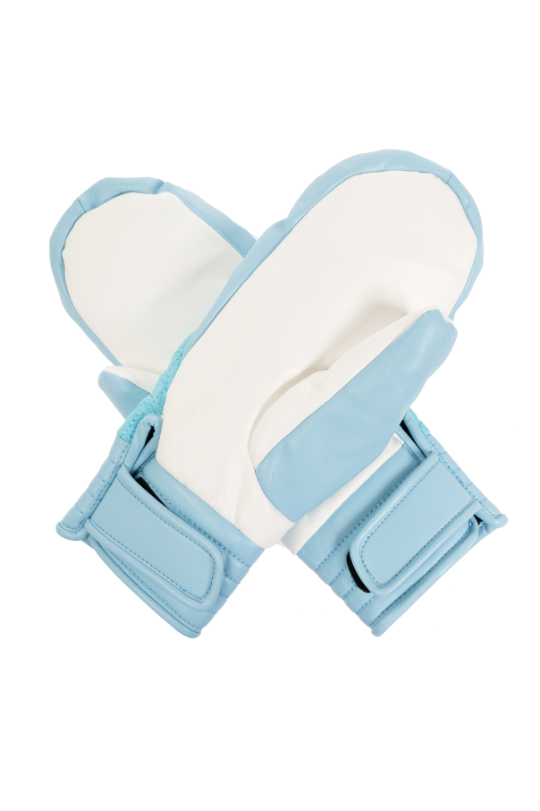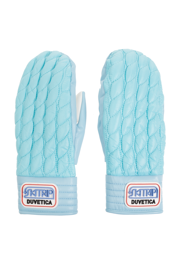 Blue and white ‘Gaetano’ gloves from Duvetica. Crafted partially from faux leather, this quilted pair features a multicolored rubber logo patch, velcro strap and fleece lining.