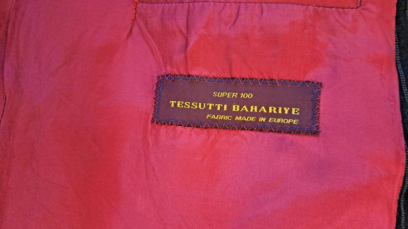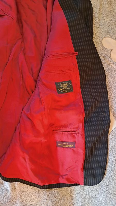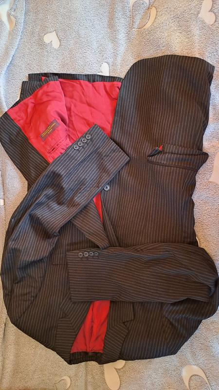 Пиджак черного цвета в тонкую вертикальную полоску с красной атласной подкладкой. Прекрасно подчеркнет мужскую фигуру. Данная вещь без дефектов, требует профессионального глажения.