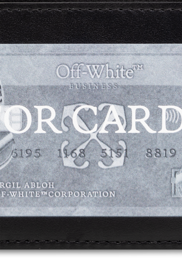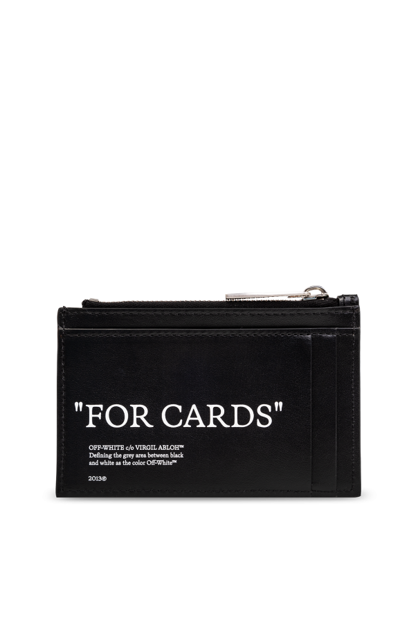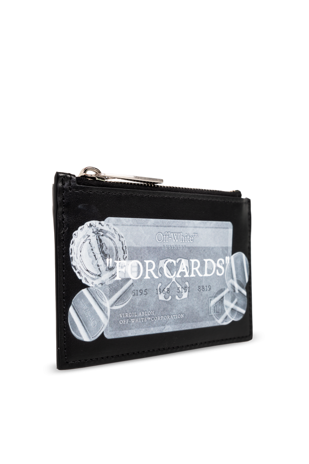 Black card case from Off-White. Made from calf leather, this item showcases a grey and white graphic print accompanied by a logo, two card slots and one internal zip pocket.