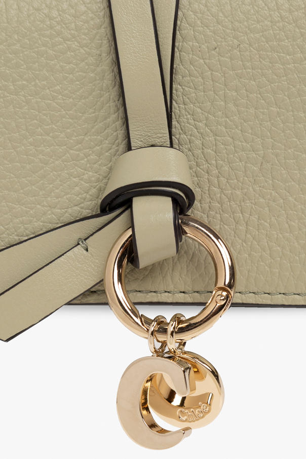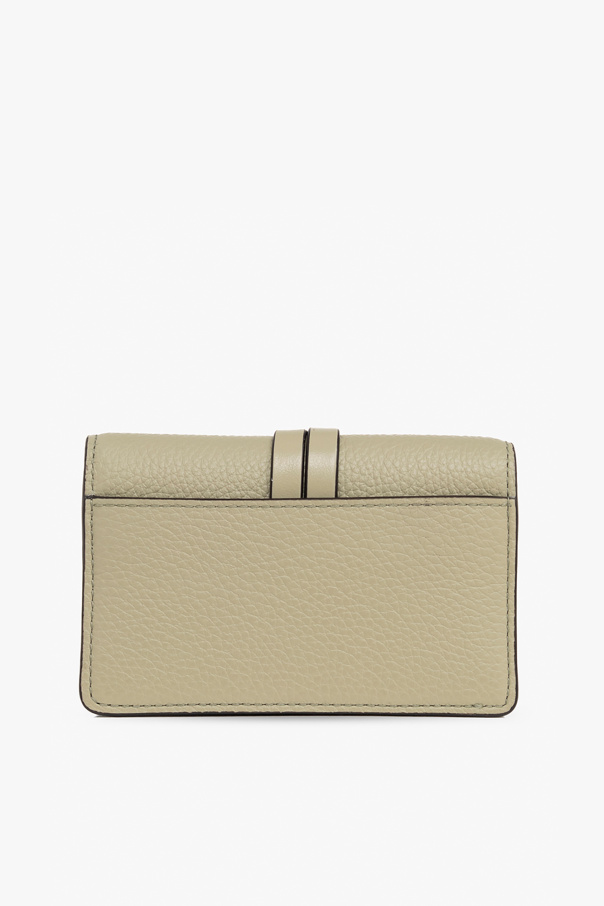 Greyish green ‘Alphabet’ card holder from Chloé. Made of calf leather, this item features a snap closure, decorative strap with detachable logo charms and one internal compartment with three card slots.
