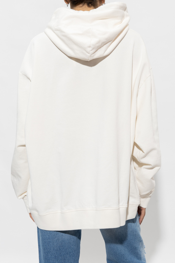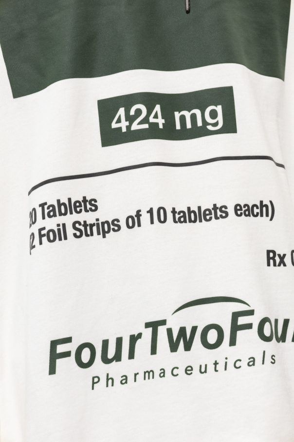 Cream sweatshirt with a drawcord-adjustable hood from 424. Crafted from cotton jersey, this style features long sleeves, a green and black graphic print with the brand's logo on the front and ribbed trims on the bottom hem and cuffs.