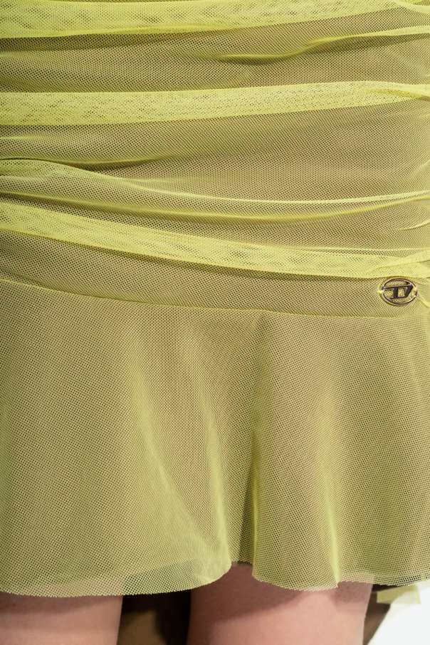 Khaki ‘O-RYT’ skirt from Diesel. Crafted with an asymmetrical silhouette, this style is cinched with drawstrings at the waist and features an elasticated waistband, yellowish green tulle accents and logo hardware.