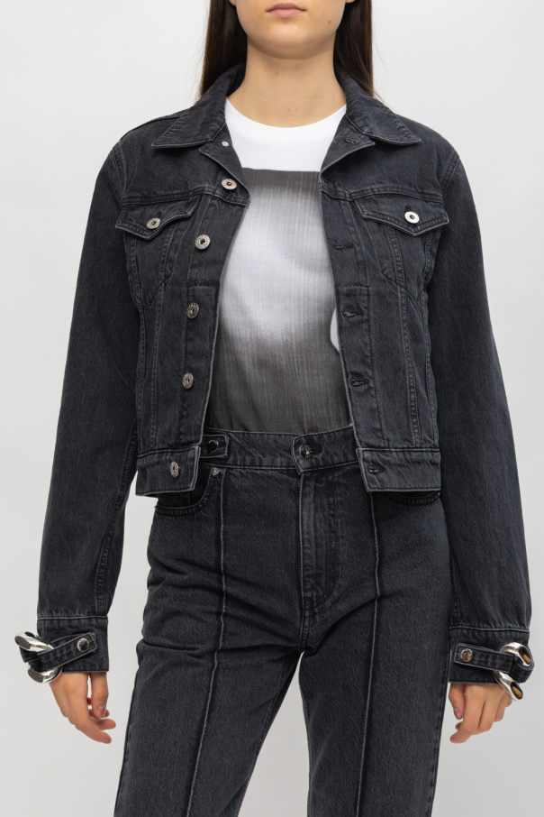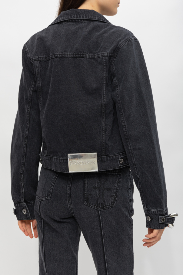 Dark grey denim jacket from JW Anderson. Made from cotton, this style features button fastenings, two slip pockets, two flapped pockets and long sleeves accentuated with chain appliqués.