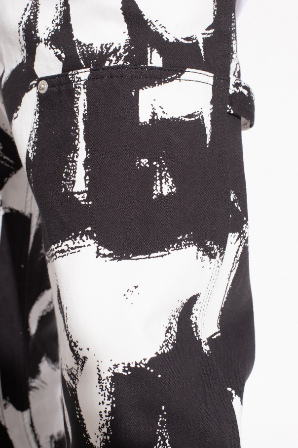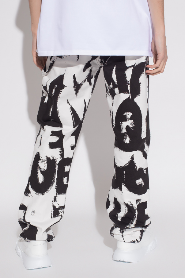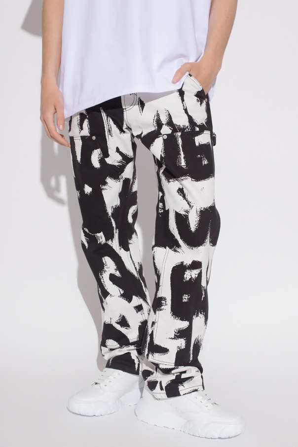 White and black jeans from Alexander McQueen. Crafted from organic cotton with a workwear-inspired relaxed silhouette, this pair falls with straight legs with rolled-up hems and features button fastenings, classic five pockets, the brand's ‘McQueen Graffiti’ print with a logo and a black patch with an embossed logo at the back.