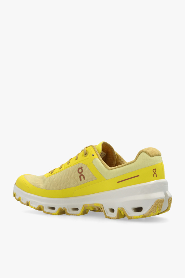 Yellow ‘Cloudventure’ sneakers from Loewe x ON. Made of fabric and rubber, this lace-up pair is complete with a brown Anagram logo on the tongue, side and back, red taping detail, cushioning CloudTec® midsole with Helion™ superfoam in white as well as an anti-slip Missiongrip™ outsole with a camo print in yellow, beige and khaki for optimal grip.