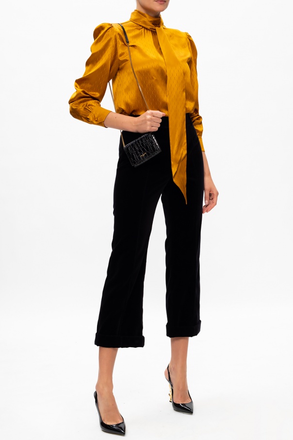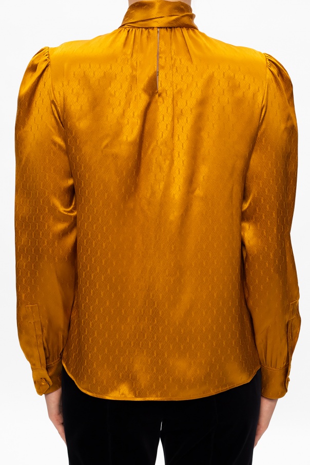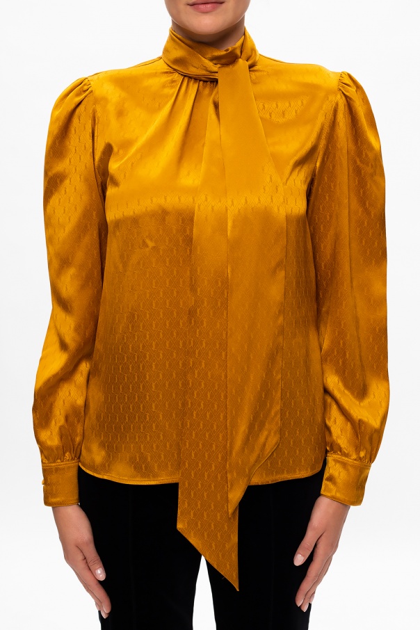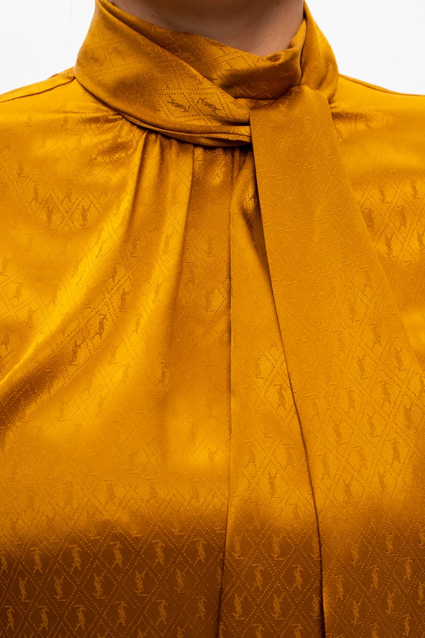 Yellow shirt from Saint Laurent. Crafted from silk, this item features a button fastening at the back, a decorative tie neck and an embroidered logo pattern.