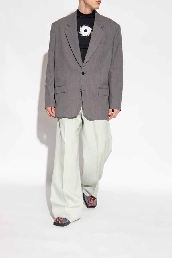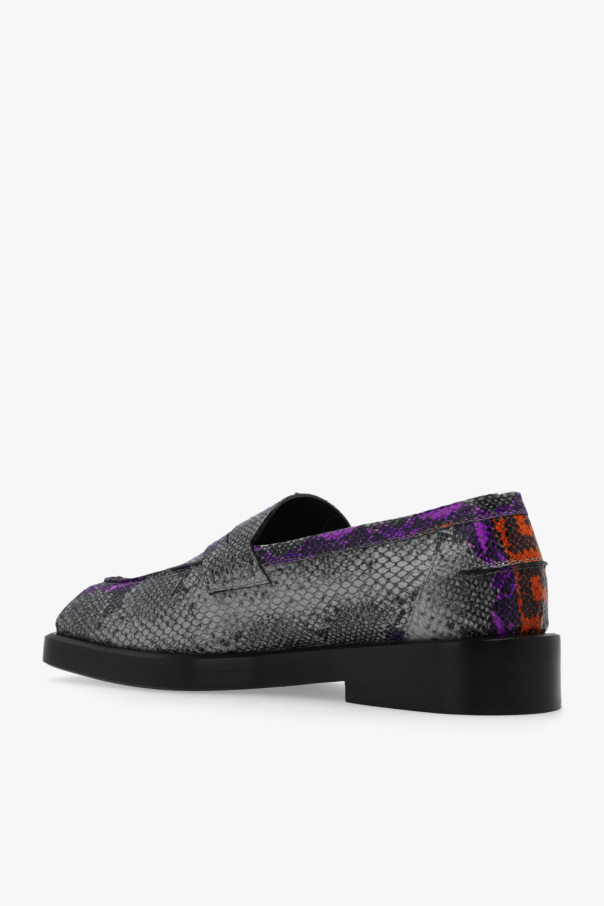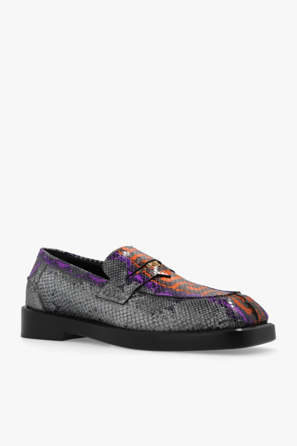 Grey, purple and orange loafers from Versace. Crafted from leather with a square toe, this model sits on a black leather sole and showcases the brand's ‘Python Greca’ pattern and Medusa hardware on the front.