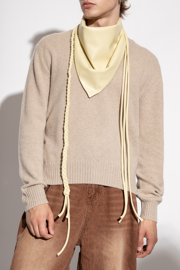 Light yellow ‘Brita’ triangle scarf from Nanushka. Made of OKOBOR™ vegan leather, this item features decorative tie fastening. OKOBOR™ is exclusive to Nanushka. Their new alternative to leather has 100% recycled backing and a more responsible composition.