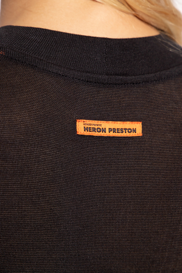 Black bodysuit from Heron Preston. Spun from viscose yarns with a sheer finish, this style features a sleeveless silhouette with white logo embroidery and snap closures at the bottom.