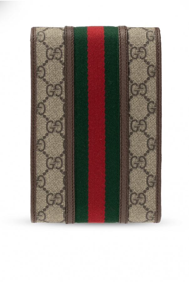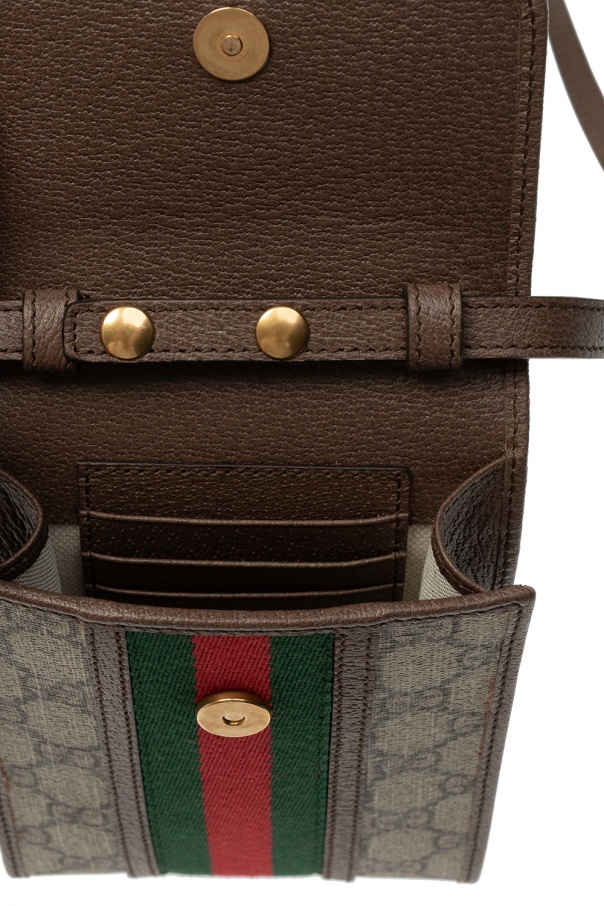 Beige and brown ‘Ophidia’ shoulder bag from Gucci. Size mini. Crafted from ‘GG Supreme’ canvas, this item is embellished with the label's iconic green-red-green Web stripe and a logo plaque. It features a snap fastening, an adjustable shoulder strap, antiqued gold-tone metal hardware and interior with one compartment and three card slots.