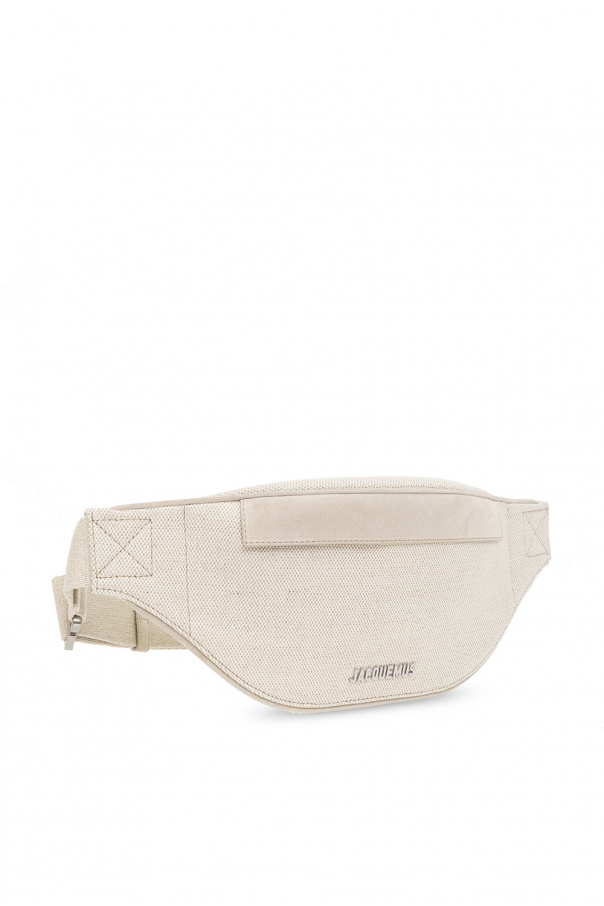 Light beige ‘Le Banane Meunier’ belt bag from Jacquemus. Crafted from a linen and cotton blend, this design secures with a zip and features a silver-tone metal logo plaque on the front, suede trims, a back zip pocket, an adjustable strap and one internal compartment with a card slot.