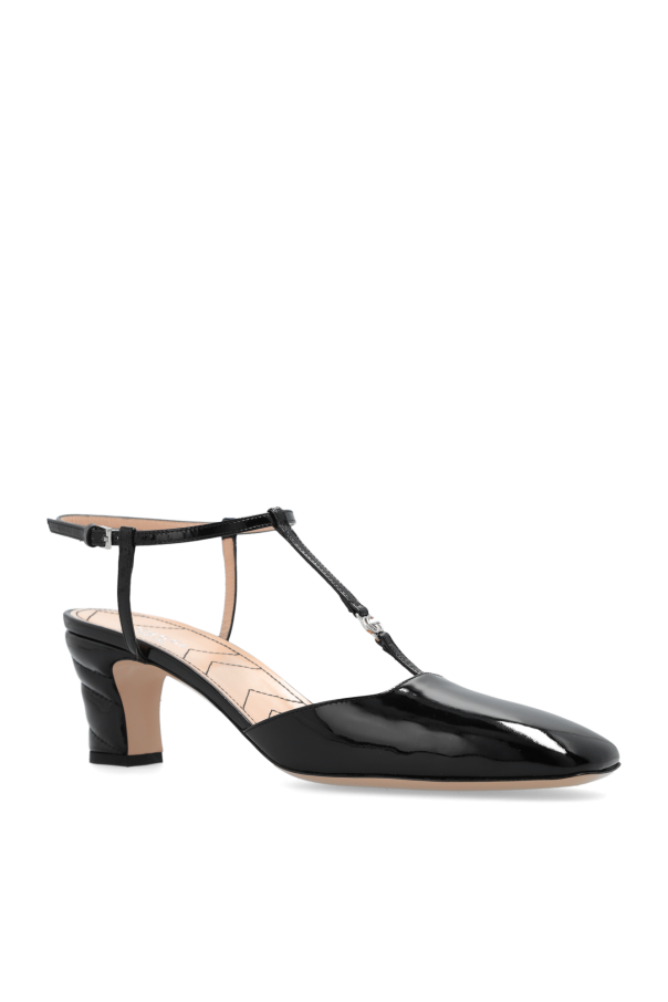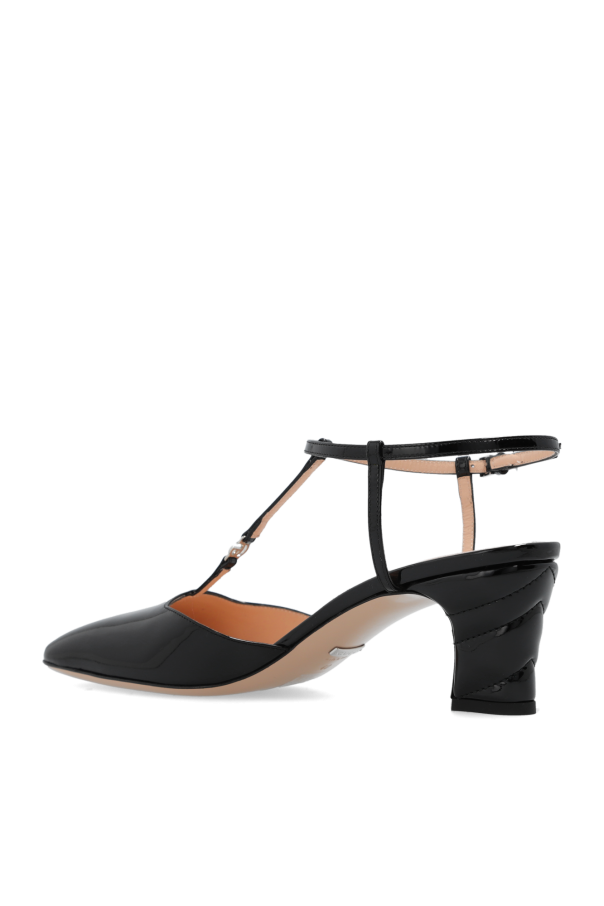 Black pumps from Gucci. Made of patent leather, this pair features a buckled ankle strap, ‘Double G’ appliqué, decorative heel trimmed with quilted leather, metal hardware in silver-tone and blush pink leather sole.
