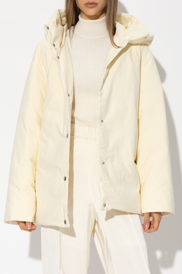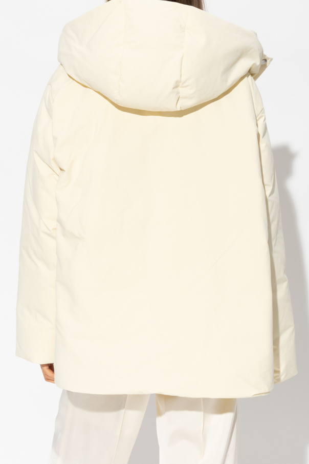 Cream hooded down jacket from Jil Sander+. Made of recycled fabric, this garment features snap fastenings, logo patch, two slip pockets, long sleeves and drawstring hem.