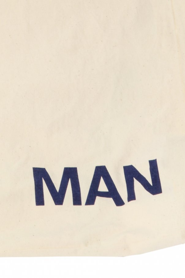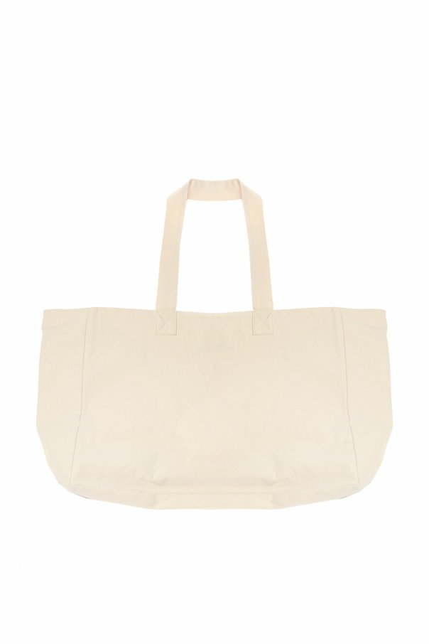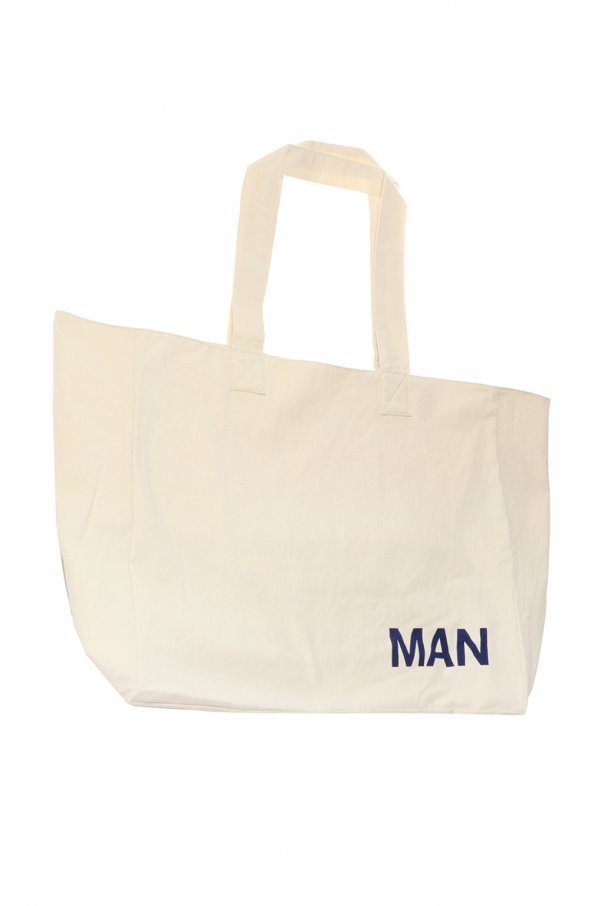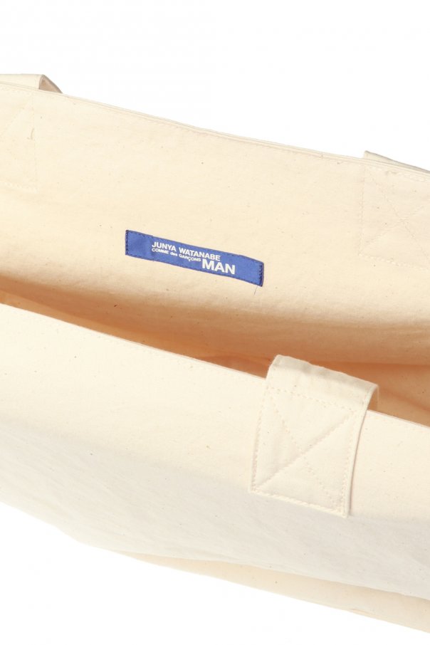 Cream tote bag from Comme des Garcons Junya Watanabe. Made of cotton. Navy print on the front. Two half-round handles.