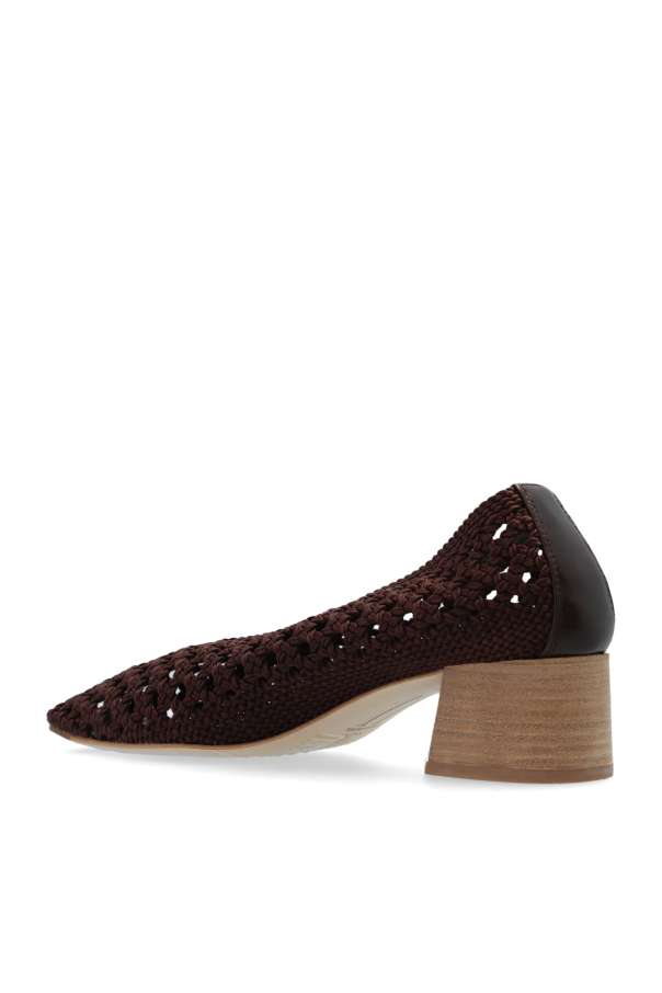 Brown ‘Taissa’ pumps from Miista. Made from handwoven cotton mix macrame, this pair features a plunging soft v-shape to the cuff, elongated square toe and a cream leather sole.