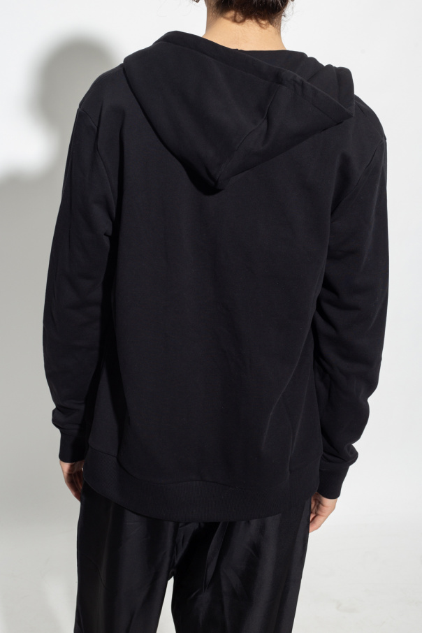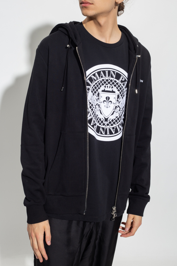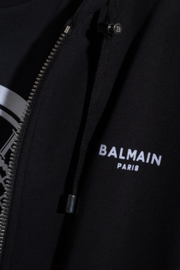 Black hoodie from Balmain. Crafted from cotton, this garment features a two-way zip, drawstring hood, white logo with a velvet finish and ribbed trims at the hem and cuffs.