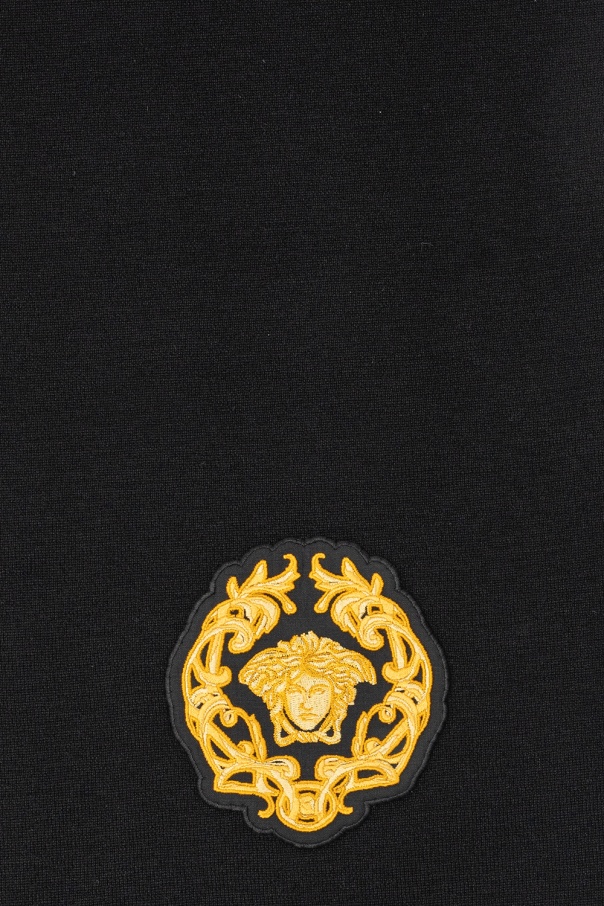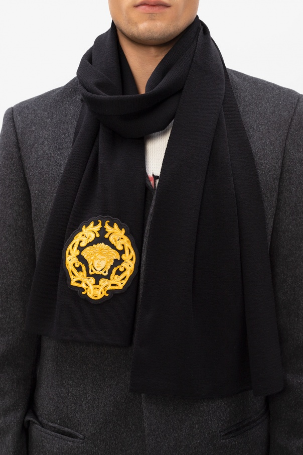 Black scarf from Versace. Crafted from wool, this item comes decorated with a logo patch in yellow and black.
