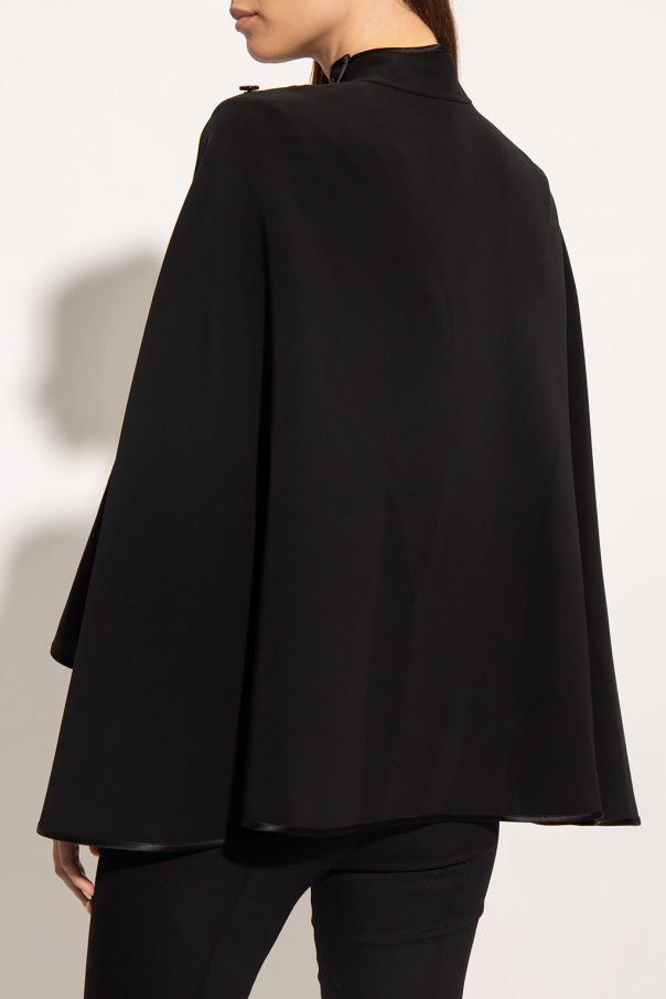 Black cape from Burberry. Made of silk, this design features button fastenings, asymmetric front, flared back and edges with contrasting trimming.