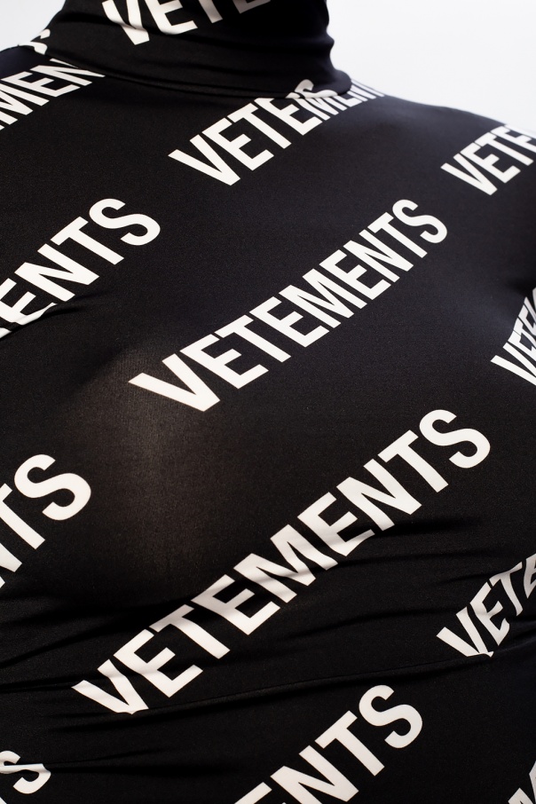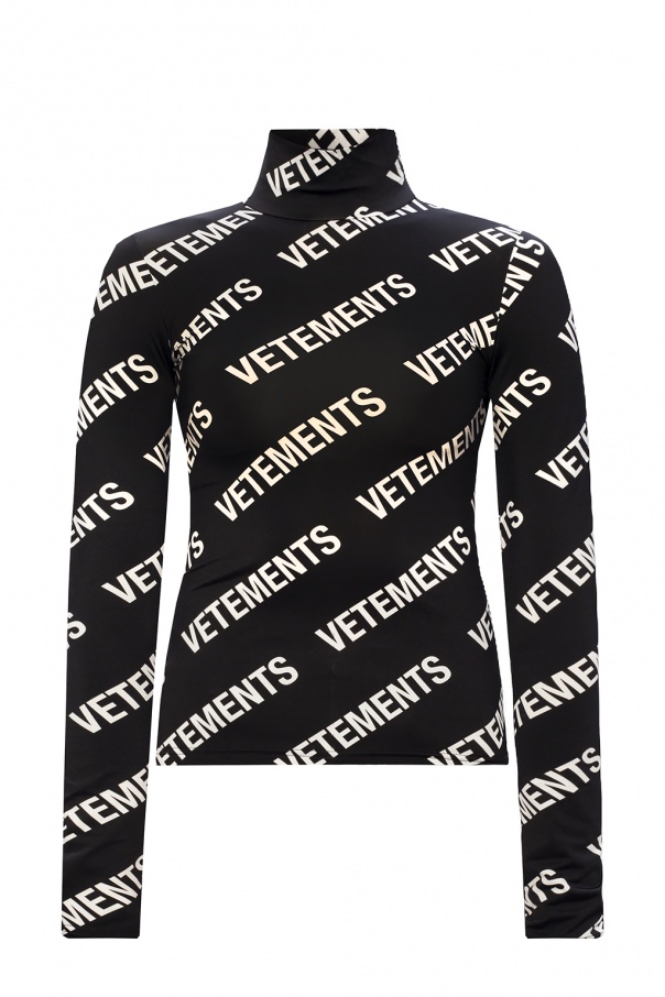 Black mock neck top from VETEMENTS. Printed with the brand's logo in white, this long-sleeved style is complete with a snug collar.