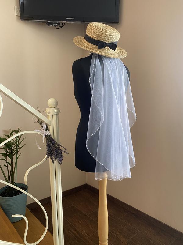 Весільна фата, один слой , з перлинно-бісерною каймою. Довжина фати 90см, ширина один метр. Фата прикріплюється на гребінець, для зручності кріпити у зачіску . У наявності є декілька відтінків єврофатину: білий, молочний, айворі, персик. Звертайтесь фото надам.