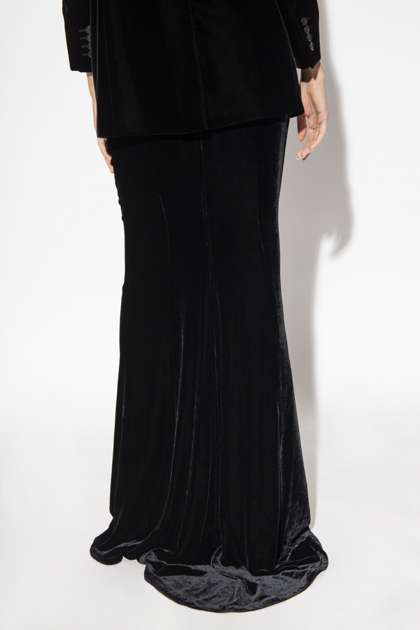 Black maxi skirt from Saint Laurent. Crafted from velvet fabric, this style features a zip fly with a button, an asymmetrical bottom hem and five pockets – a back one has a logo patch.