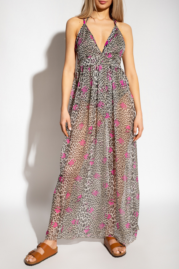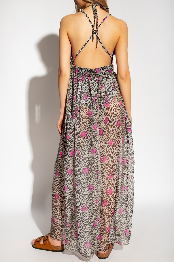 Beige and black sheer off-the shoulder beach dress from Zadig & Voltaire. Made of silk, this design is complete with a side zip, printed pattern in pink, animal motif and ties at the nape of the neck.