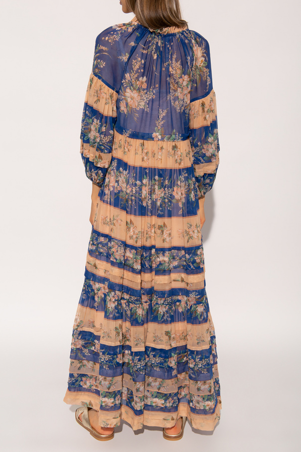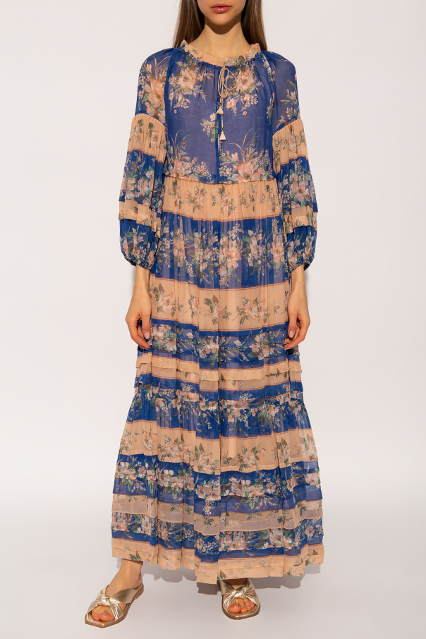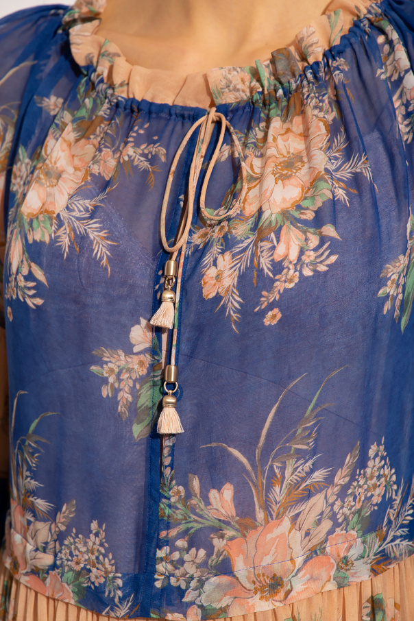 Multicoloured dress from Zimmermann. Crafted from a cotton and silk blend and decorated with a floral pattern, this style features a self tie neckline, a hidden zip closure on the side and blouson sleeves with elasticated cuffs. It comes with a separate cream slip with adjustable shoulder straps.