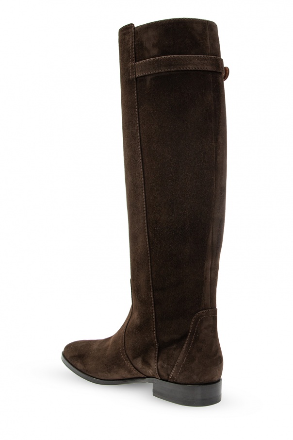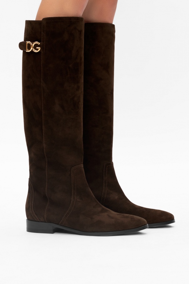 Brown boots from Dolce & Gabbana. Crafted from suede, this slip-on design is complete with stitching details, a metal logo in gold-tone and a brown leather sole.
