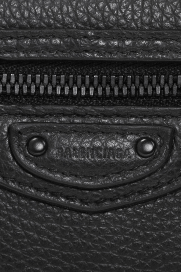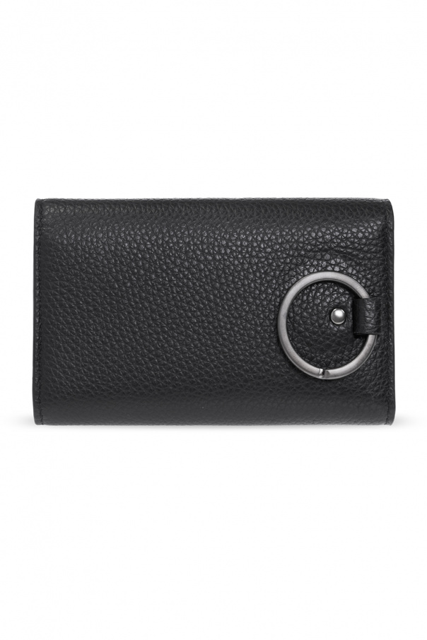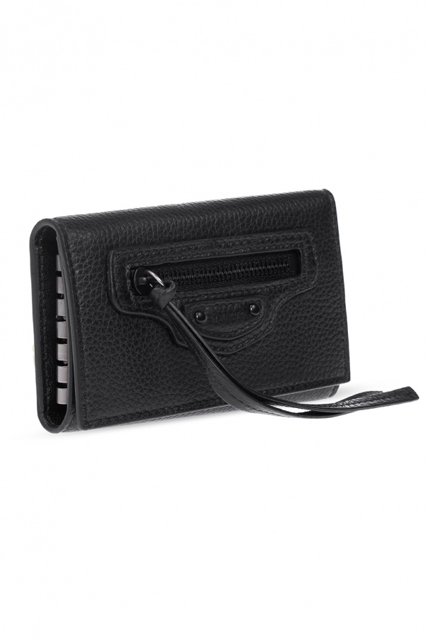 Black key holder from Balenciaga. Made of calf leather, this model features a snap closure, zip pocket, logo-embossed patch, keyring at the back and black metal hardware as well as three slip pockets and six snap hooks.