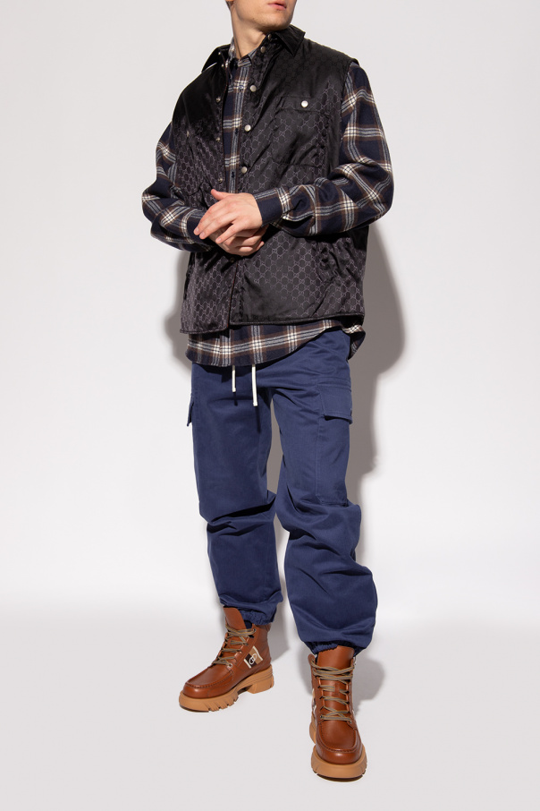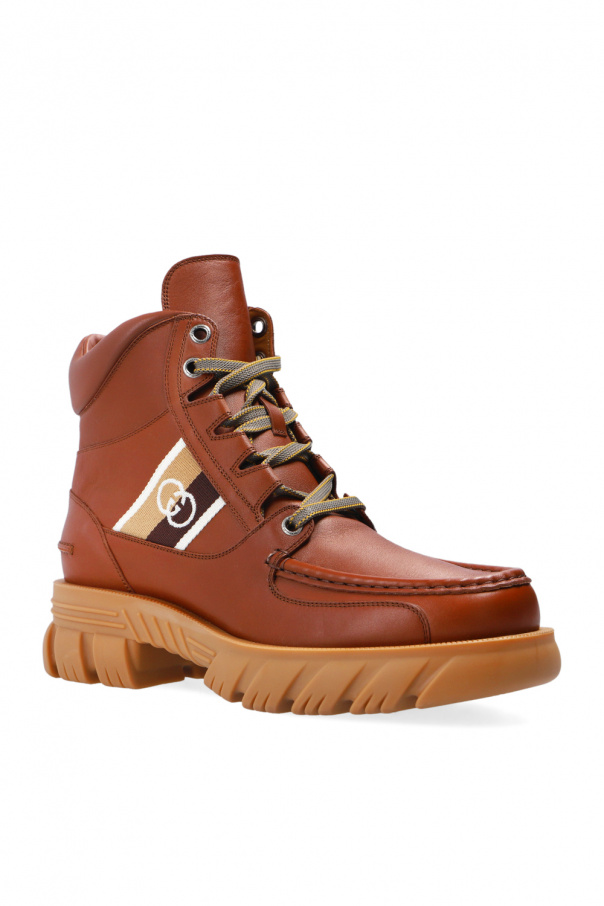 Brown boots from Gucci. Made of leather, this lace-up pair features a stripe with the Interlocking G logo in cream, brown and beige as well as a pair of additional laces and a beige rubber sole.