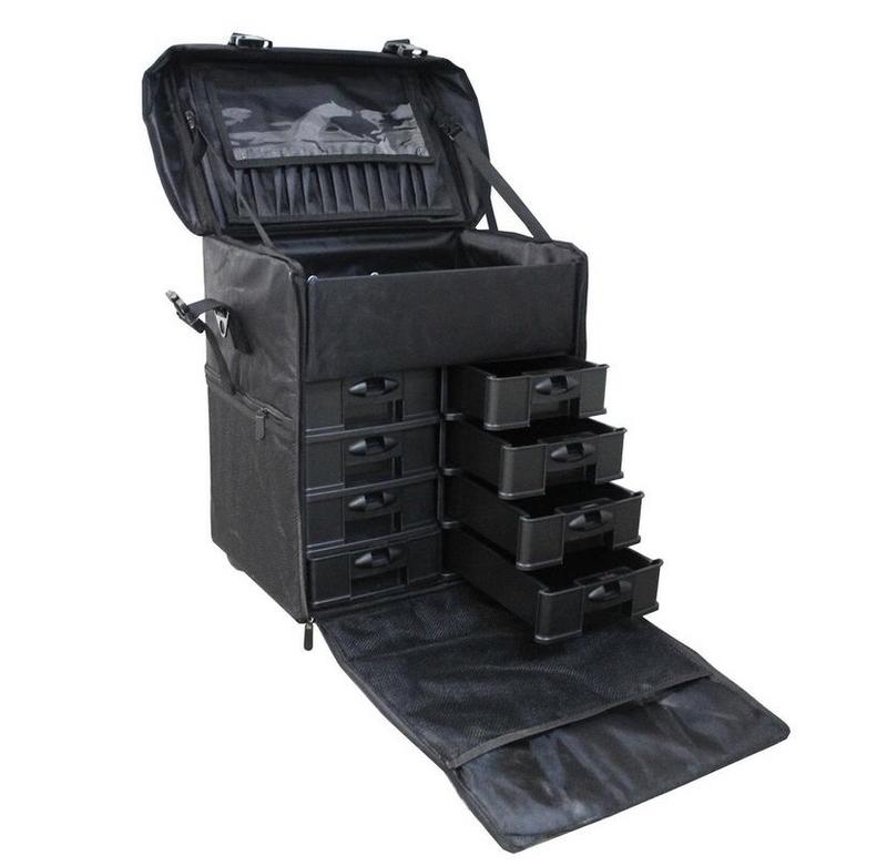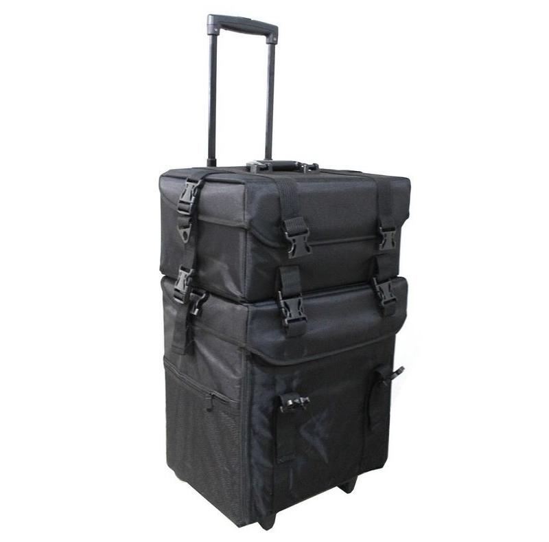 Зручний кейс на колесах з висувною ручкою для транспортування перукарських або косметологічних приладів.