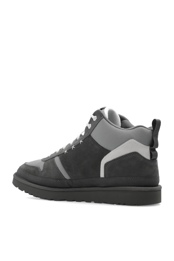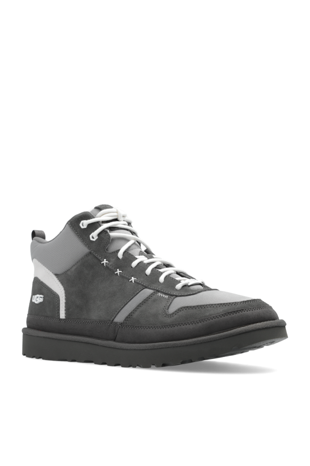 Grey ‘Highland Hi Heritage’ snow boots from UGG. This model sits on a grey rubber outsole and features a high-top silhouette, metal hardware, a microfiber mudguard, a rear pull tab made from 100% recycled polyester fibers and a SugarSole™ EVA outsole.