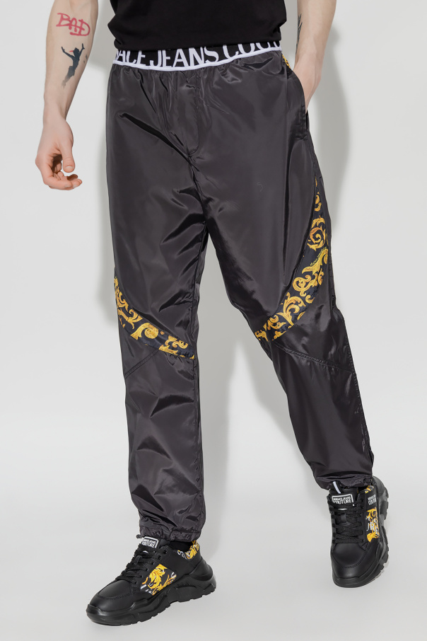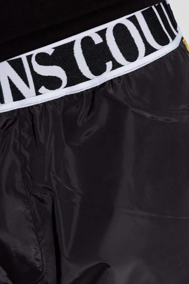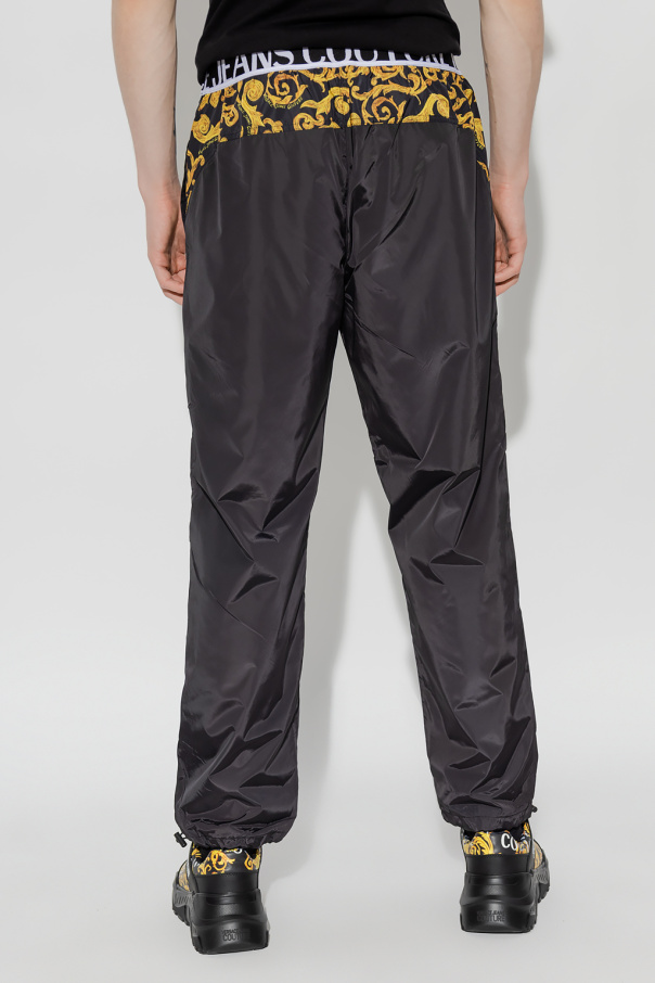 Black track pants from Versace Jeans Couture. Embellished with the brand's signature ‘Logo Couture’ print, this pair features a black and white branded waistband, two frontal pockets and drawstring cuffs.