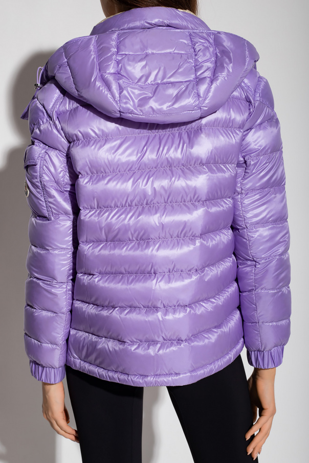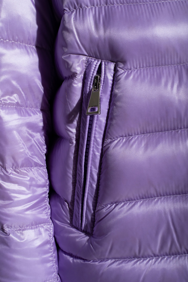 Light purple ‘Dalles’ quilted down jacket from Moncler. Emblazoned with a cream logo patch, this style features a two-way zip fastening, a detachable drawstring hood, two zipped pockets, flapped sleeve pockets and elasticized edges.