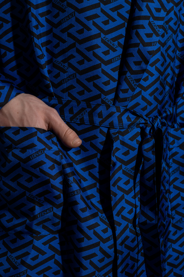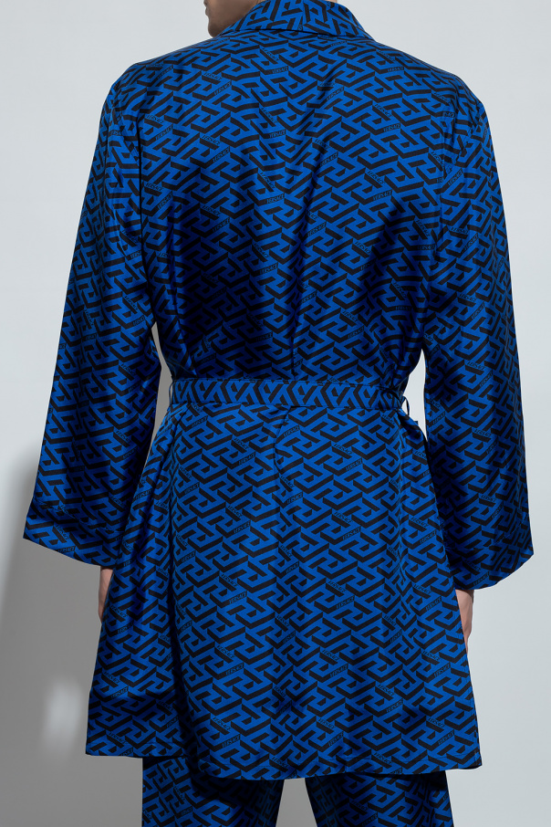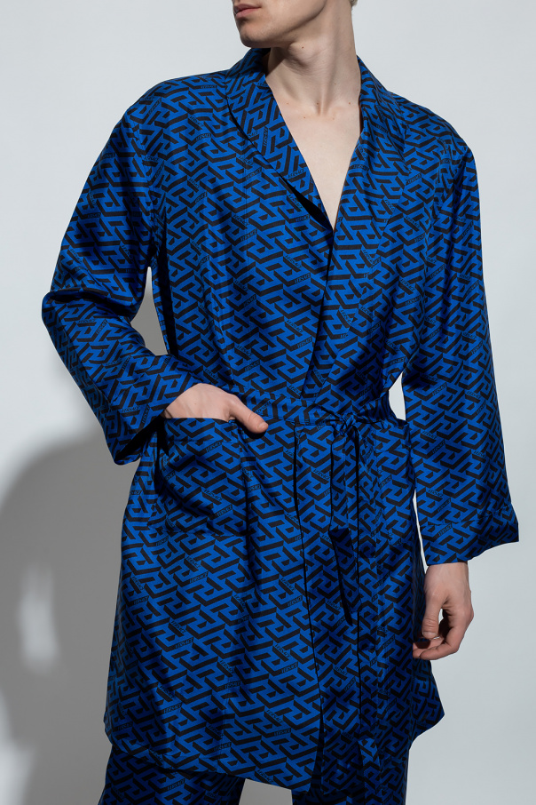 Blue and black bathrobe from Versace. Made of silk and decorated with the brand's signature ‘La Greca’ pattern, this style features a waist-cinching belt, two slip pockets and long sleeves.