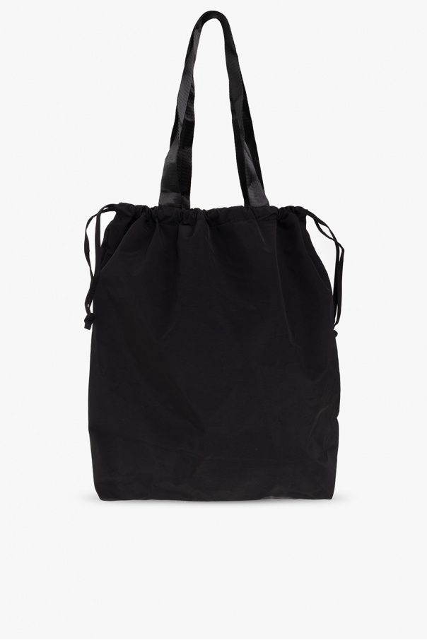 Black waterproof shopper bag from White Mountaineering. This model features a logo print, two half-round handles and one internal compartment with drawstrings. Can be stored in an inside pocket.