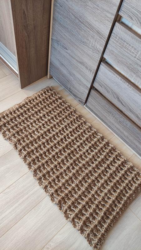 Двосторонній килимок із натурального джуту в'язаний гачком. Грубий рифлений візерунок дає неперевершений масажний ефект при дотику. Висока якість. Ручна робота.