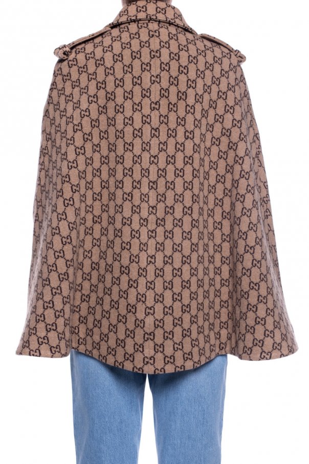 Beige poncho from Gucci. Made of wool. Fastened with buttons. Decorated with a brown logo pattern. Epaulettes on the shoulders. Two flap pockets fastened with buttons on the front. Gold-tone buttons.